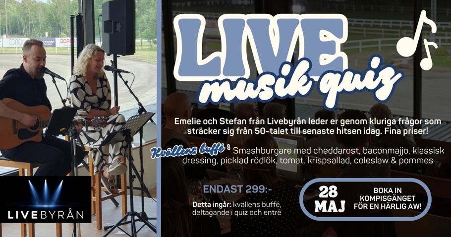 Emelie och Stefan från Livebyrån leder er genom kluriga frågor som sträcker sig från 50-talet till senaste hitsen från idag. Fina priser!