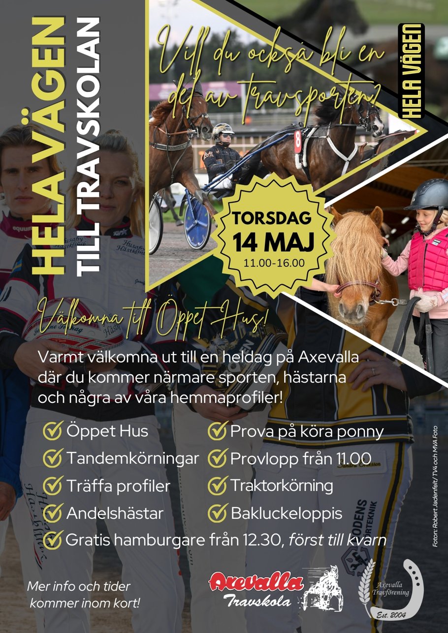 Är du också nyfiken på vad som händer bakom kulisserna i travsporten eller vill vara en del av den underbara gemenskapen inom travet? Då är det läge att boka in den 14 maj i kalendern, för då anordnar vi öppet hus på Axevalla Travskola! Vi bjuder på allt möjligt för alla åldrar. Mer info och hålltider kommer inom kort.
