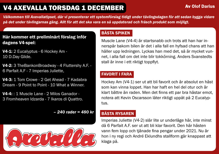 Välkommen till Axevallatipset, där vi presenterar ett systemförslag tidigt under tävlingsdagen för att sedan bygga vidare på det under tävlingarnas gång. Allt för att det ska vara en så uppdaterad och fräsch produkt som möjligt.