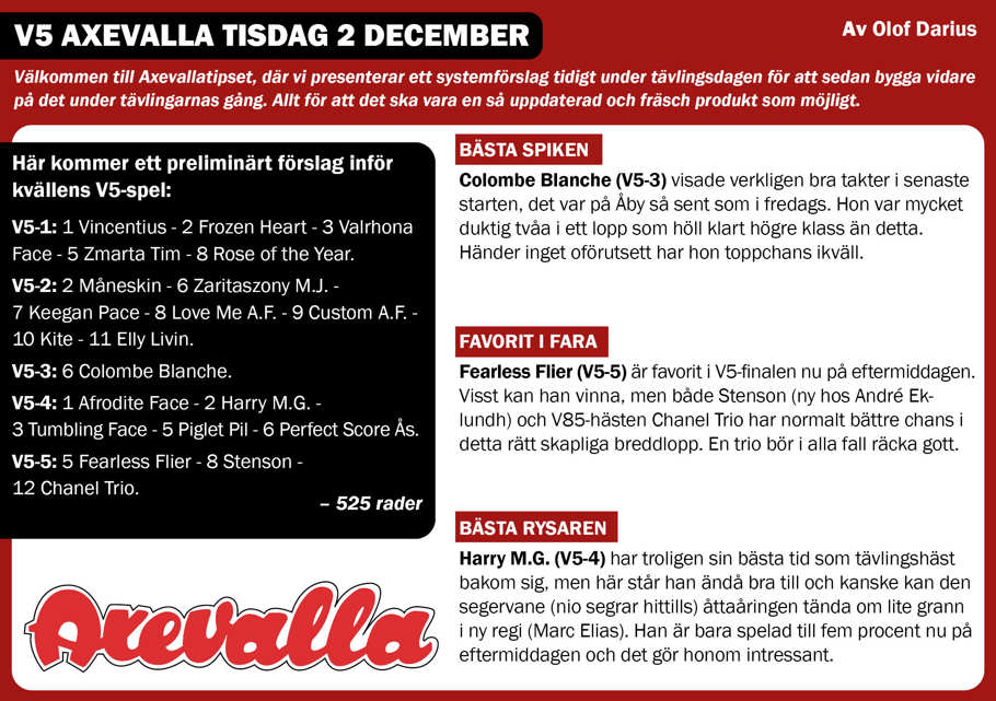 Välkommen till Axevallatipset, där vi presenterar ett systemförslag tidigt under tävlingsdagen för att sedan bygga vidare på det under tävlingarnas gång. Allt för att det ska vara en så uppdaterad och fräsch produkt som möjligt.