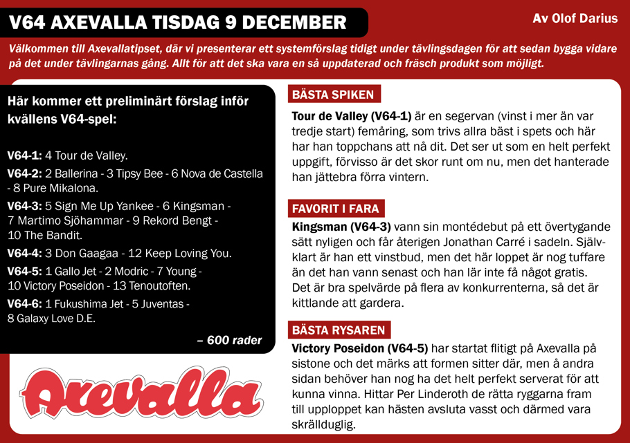 Välkommen till Axevallatipset, där vi presenterar ett systemförslag tidigt under tävlingsdagen för att sedan bygga vidare på det under tävlingarnas gång. Allt för att det ska vara en så uppdaterad och fräsch produkt som möjligt.