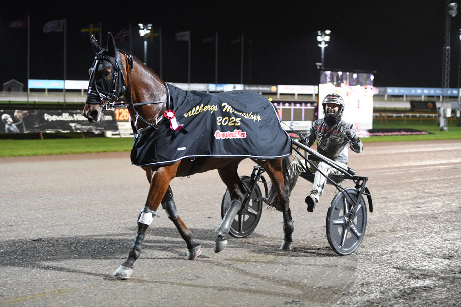 Det var en regnig men välbesökt kväll när vi under tisdagen körde ett av årets profillopp; Ullbergs Minne som vanns av Maria Törnqvists Jackpot Mearas med Dwight Pieters vid tömmarna. Team Törnqvist/Pieters vann även samma lopp i fjol, då med Ture L.A. Daniel Redén slog till med en trippelseger som kusk med egentränat. Enda hemmasegern för kvällen plockade Rebecka Lennartsson hem med David Perssons Sainz Zon. Alla bilder: MVA Foto.