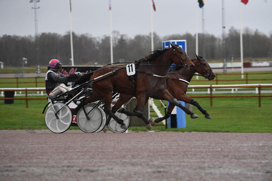 13 Abbagliante - Carl Johan Jepson (Sofia Aronsson Hofstedt) 1.15,8. Andra utvändigt, fram utvändigt om ledaren på slutvarvet, tog över redan 850 kvar, hade ett klart kommando in på upploppet, höll undan knappt men säkert.