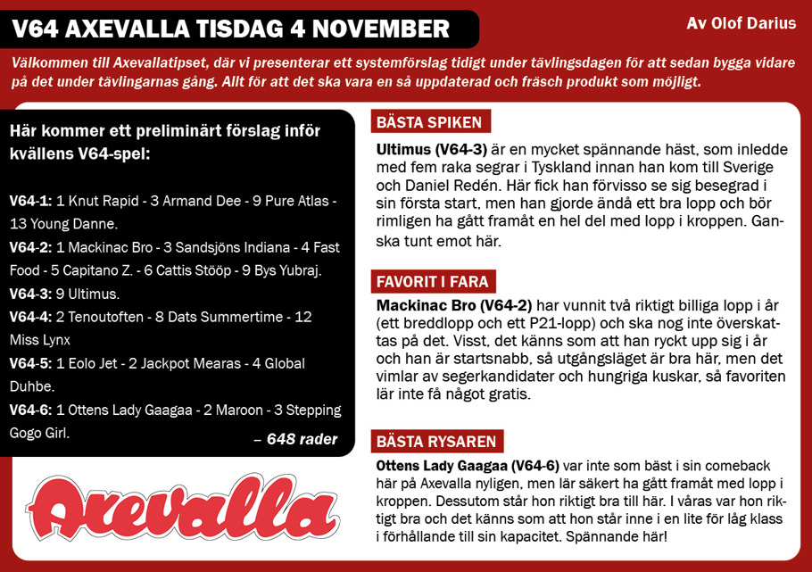 Välkommen till Axevallatipset, där vi presenterar ett systemförslag tidigt under tävlingsdagen för att sedan bygga vidare på det under tävlingarnas gång. Allt för att det ska vara en så uppdaterad och fräsch produkt som möjligt.