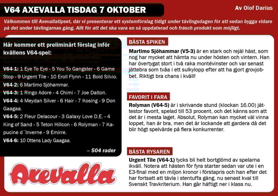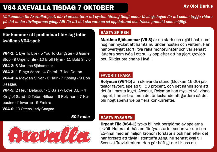 Välkommen till Axevallatipset, där vi presenterar ett systemförslag tidigt under tävlingsdagen för att sedan bygga vidare på det under tävlingarnas gång. Allt för att det ska vara en så uppdaterad och fräsch produkt som möjligt.