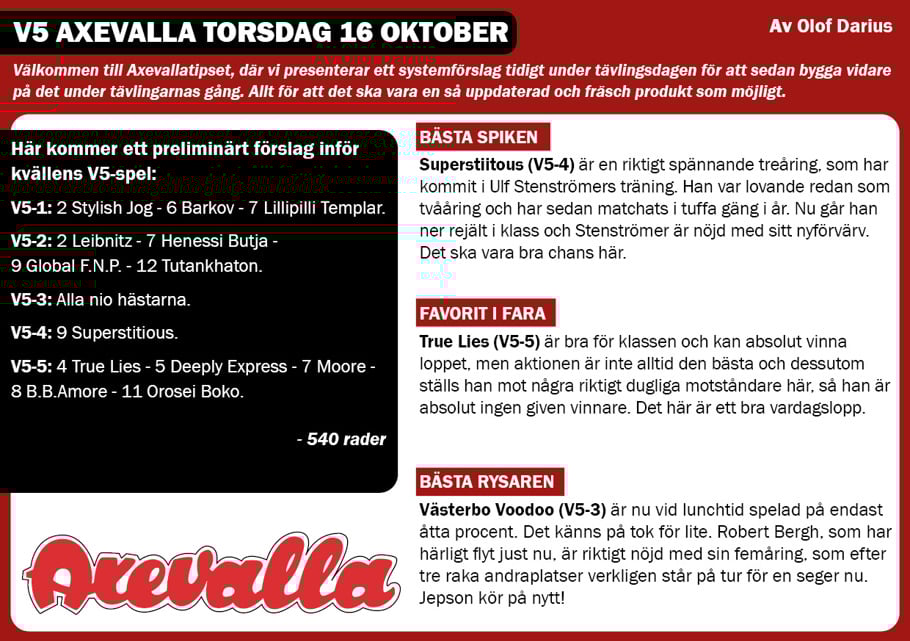 Välkommen till Axevallatipset, där vi presenterar ett systemförslag tidigt under tävlingsdagen för att sedan bygga vidare på det under tävlingarnas gång. Allt för att det ska vara en så uppdaterad och fräsch produkt som möjligt.