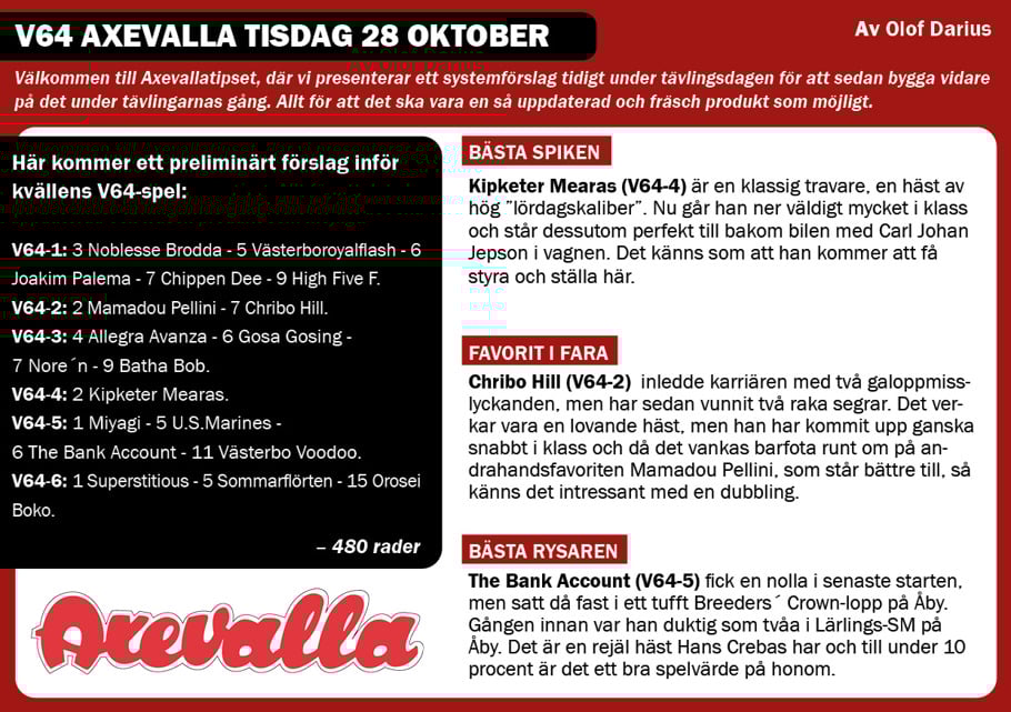 Välkommen till Axevallatipset, där vi presenterar ett systemförslag tidigt under tävlingsdagen för att sedan bygga vidare på det under tävlingarnas gång. Allt för att det ska vara en så uppdaterad och fräsch produkt som möjligt.