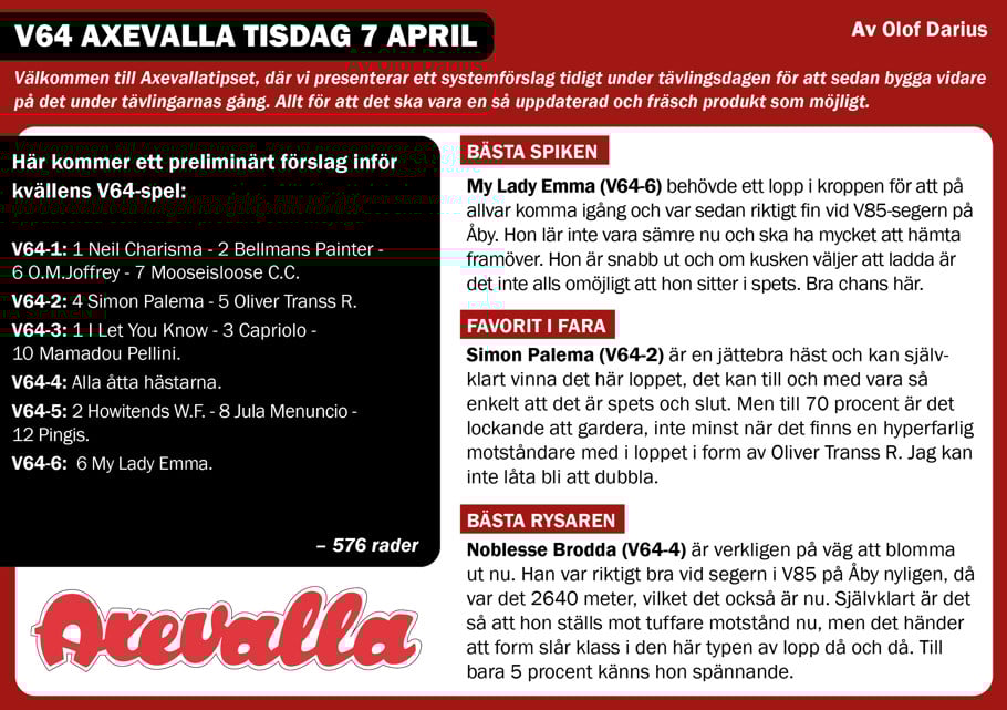 Välkommen till Axevallatipset, där vi presenterar ett systemförslag tidigt under tävlingsdagen för att sedan bygga vidare på det under tävlingarnas gång. Allt för att det ska vara en så uppdaterad och fräsch produkt som möjligt.