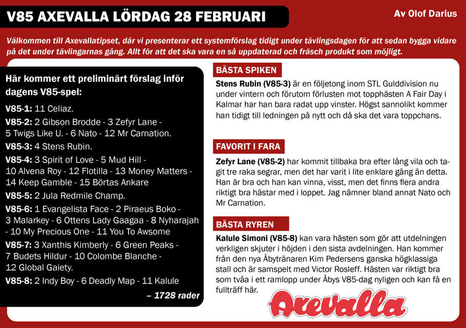 Här kommer ett preliminärt förslag inför dagens V85-spel: